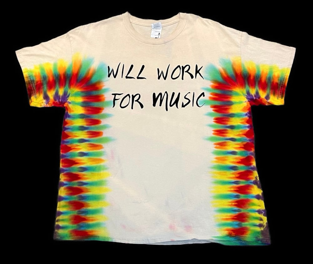 Thrifted Work for Music tee upcycled with rainbow tie dye